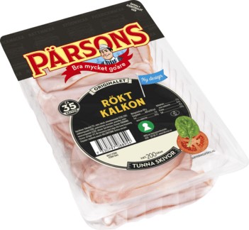 Pärsons rökta kalkon är smak och fettsnålhet i ett! Pålägget är gjort på utvalda kalkonbröst som först saltas innan de röks. Mycket saftig konsistens. Endast 2% fett. Tunnskivad. Vikt/skiva: ca 5gr Antal/frp: ca 38st.